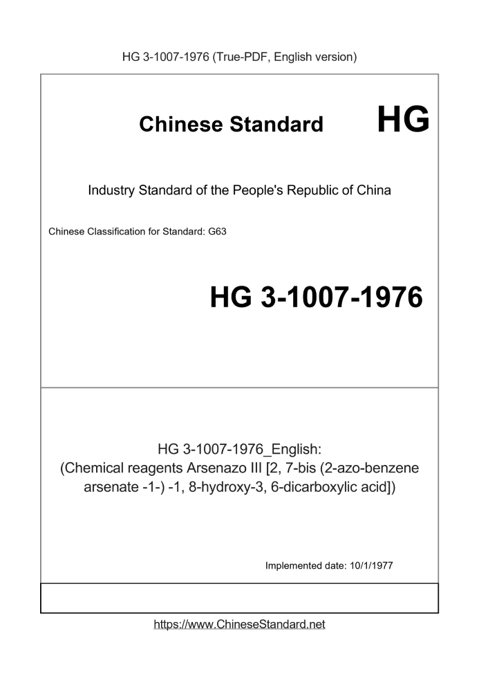 Delivery: <= 2 days. True-PDF full-copy in English will be manually translated and delivered via email. HG 3-1007-1976: (Chemical reagents Arsenazo III [2, 7-bis (2-azo-benzene arsenate -1-) -1, 8-hydroxy-3, 6-dicarboxylic acid]) Status: Obsolete