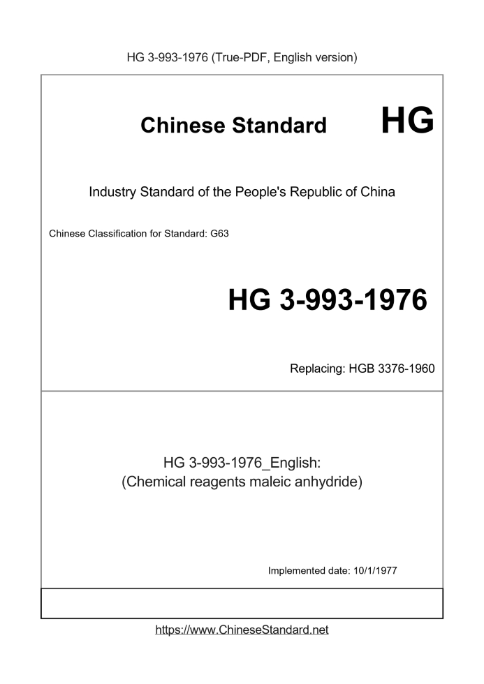 Delivery: <= 2 days. True-PDF full-copy in English will be manually translated and delivered via email. HG 3-993-1976: (Chemical reagents maleic anhydride) Status: Obsolete