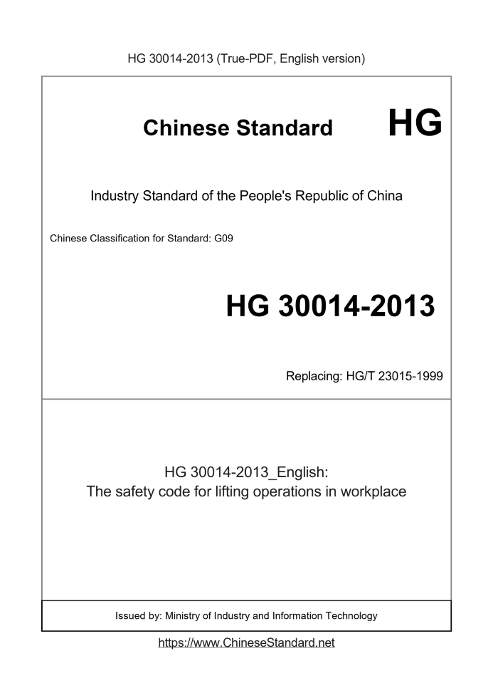 Basic dataStandard ID: HG 30014-2013 (HG30014-2013)Description (Translated English): The safety code for lifting operations in workplace Sector / Industry: Chemical Industry Standard Classification of Chinese Standard: G09 Classification of International Standard: 71.02 Word Count Estimation: 7,794 Older Standard (superseded by this standard): HG/T 23015-1999 Quoted Standard: GB 2811; GB 5082; GB 16179 Regulation (derived from): Ministry of Industry and Information Technology Bulletin No. 71 of 2013; industry standard for filing Notice No. 2 of 2014 (No. 170 overall) Issuing agency(ies): Ministry of Industry and Information Technology Summary: This standard specifies the chemical production region classification lifting operations, basic safety requirements, safety inspections, safety measures, the operator shall comply with the provisions of workers finished the job should be done and "the saf Tips & Frequently Asked Questions:Question 1: How long will the true-PDF of HG 30014-2013_English be delivered?Answer: Upon your order, we will start to translate HG 30014-2013_English as soon as possible, and keep you informed of the progress. The lead time is typically in 9 seconds (download/delivered in 9 seconds). The lengthier the document the longer the lead time.Question 2: Can I share the purchased PDF of HG 30014-2013_English with my colleagues?Answer: Yes. The purchased PDF of HG 30014-2013_English will be deemed to be sold to your employer/organization who actually pays for it, including your colleagues and your employer's intranet.Question 3: Does the price include tax/VAT?Answer: Yes. Our tax invoice, downloaded/delivered in 9 seconds, includes all tax/VAT and complies with 100+ countries' tax regulations (tax exempted in 100+ countries) -- See Avoidance of Double Taxation Agreements (DTAs): List of DTAs signed between Singapore and 100+ countriesQuestion 4: Do you accept my currency other than USD?Answer: Yes. If you need your currency to be printed on the invoice, please write an email to Sales@ChineseStandard.net. In 2 working-hours, we will create a special link for you to pay in any currencies. Otherwise, follow the normal steps: Add to Cart -- Checkout -- Select your currency to pay. |
