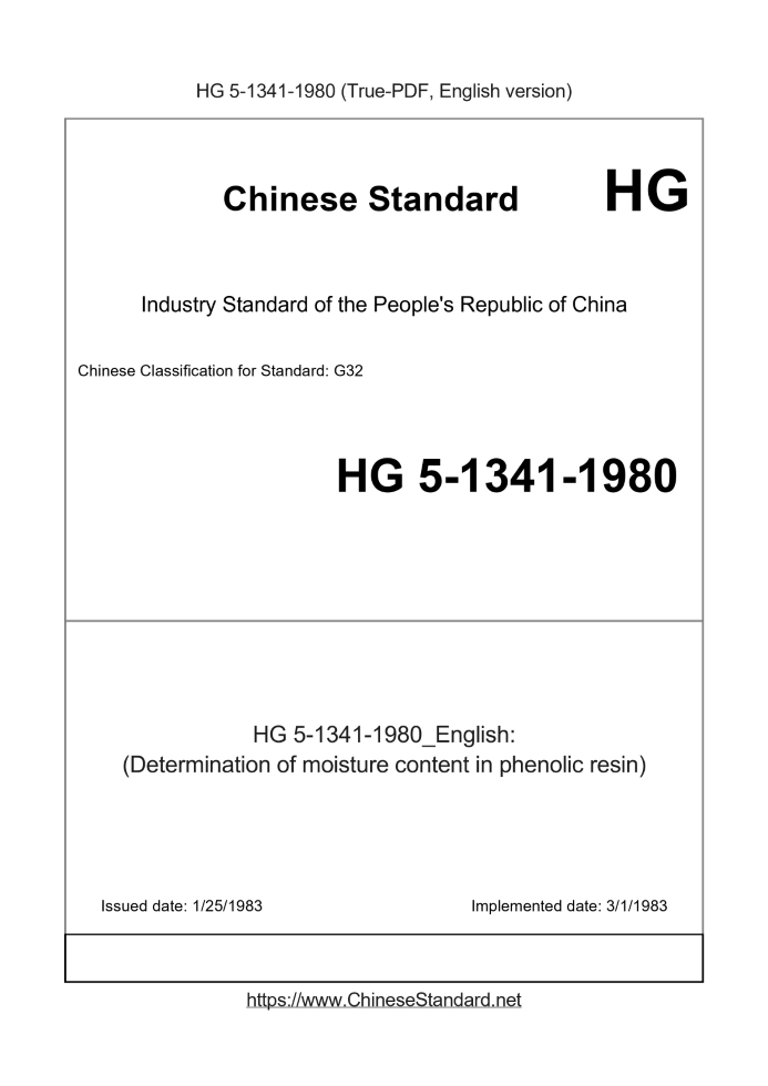 Delivery: <= 2 days. True-PDF full-copy in English will be manually translated and delivered via email. HG 5-1341-1980: (Determination of moisture content in phenolic resin) Status: Obsolete