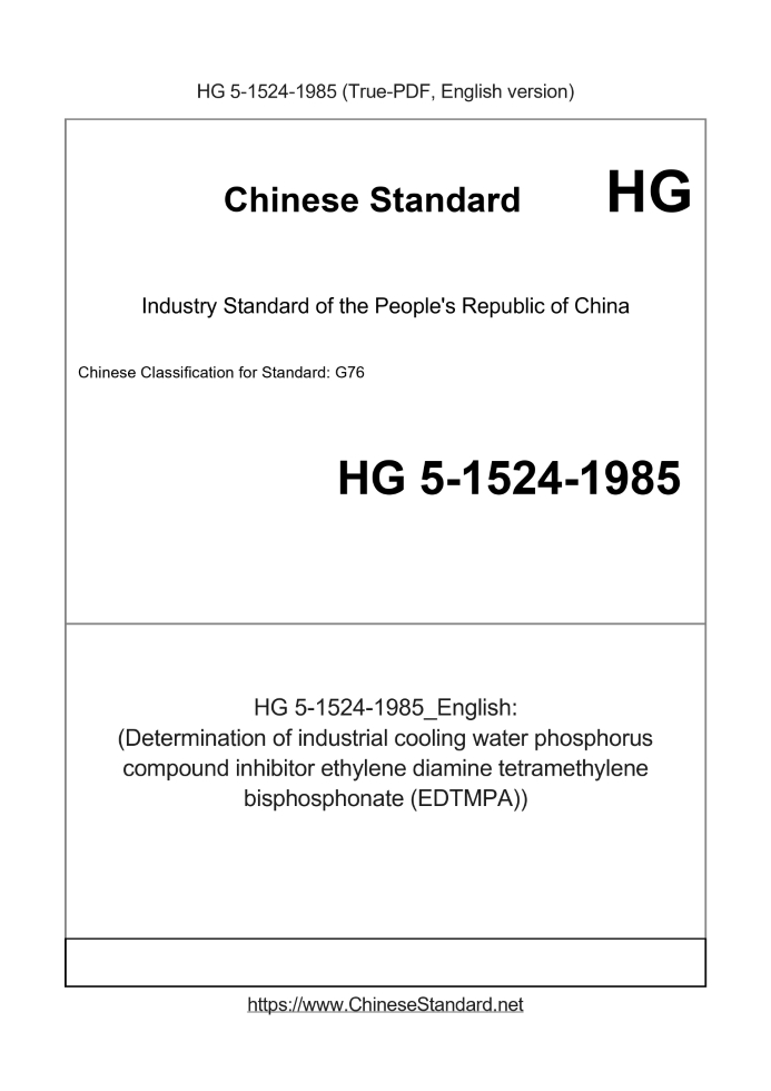 Delivery: <= 2 days. True-PDF full-copy in English will be manually translated and delivered via email. HG 5-1524-1985: (Determination of industrial cooling water phosphorus compound inhibitor ethylene diamine tetramethylene bisphosphonate (EDTMPA)) Status: Obsolete