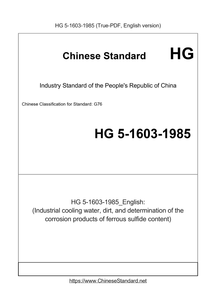 Delivery: <= 2 days. True-PDF full-copy in English will be manually translated and delivered via email. HG 5-1603-1985: (Industrial cooling water, dirt, and determination of the corrosion products of ferrous sulfide content) Status: Obsolete