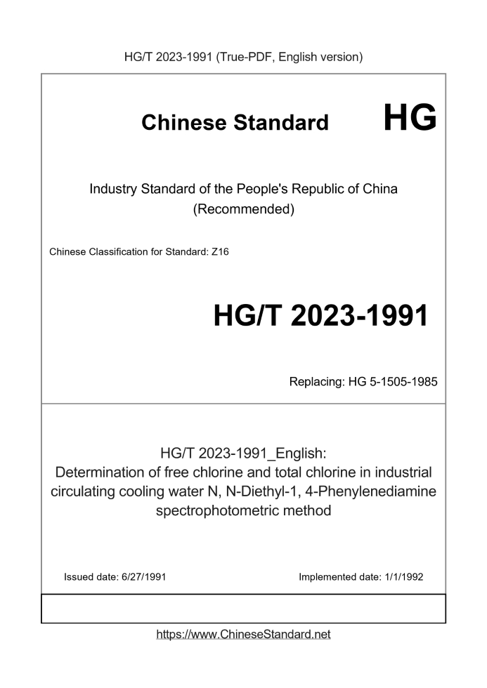 Delivery: <= 2 days. True-PDF full-copy in English will be manually translated and delivered via email. HG/T 2023-1991: Determination of free chlorine and total chlorine in industrial circulating cooling water N, N-Diethyl-1, 4-Phenylenediamine spectrophotometric method Status: Obsolete