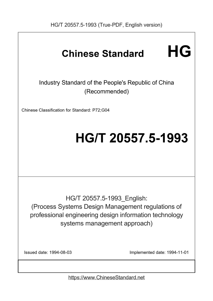 Delivery: <= 3 days. True-PDF full-copy in English will be manually translated and delivered via email. HG/T 20557.5-1993: (Process Systems Design Management regulations of professional engineering design information technology systems management approach)