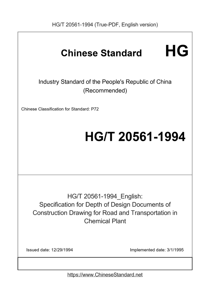 Delivery: <= 6 days. True-PDF full-copy in English will be manually translated and delivered via email. HG/T 20561-1994: Specification for Depth of Design Documents of Construction Drawing for Road and Transportation in Chemical Plant