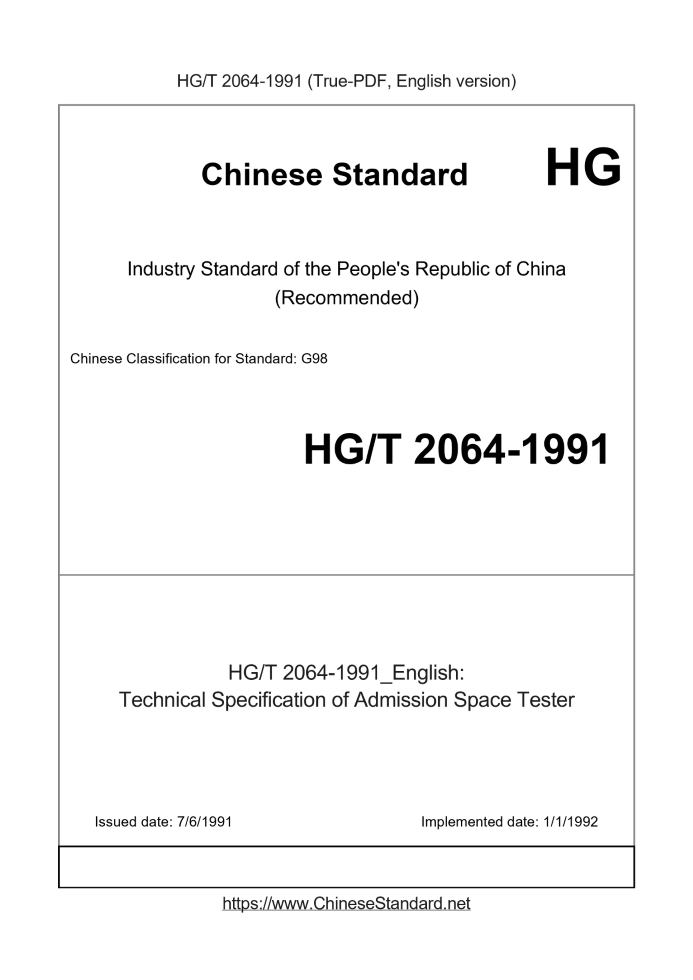 Delivery: <= 3 days. True-PDF full-copy in English will be manually translated and delivered via email. HG/T 2064-1991: Technical Specification of Admission Space Tester