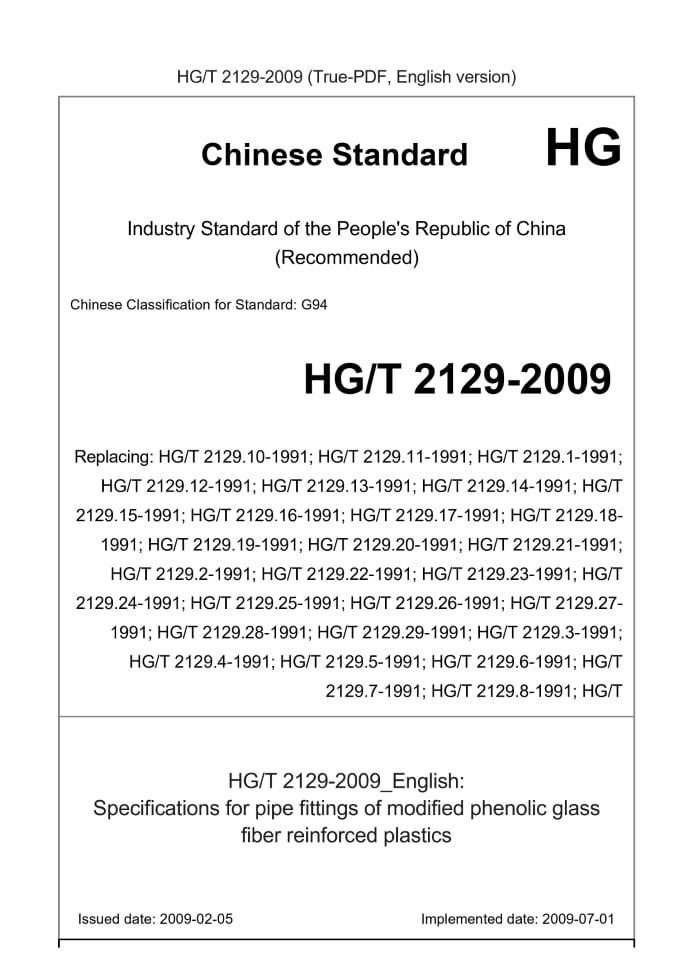 Delivery: <= 3 days. True-PDF full-copy in English will be manually translated and delivered via email. HG/T 2129-2009: Specifications for pipe fittings of modified phenolic glass fiber reinforced plastics Status: Valid HG/T 2129: Historical versions