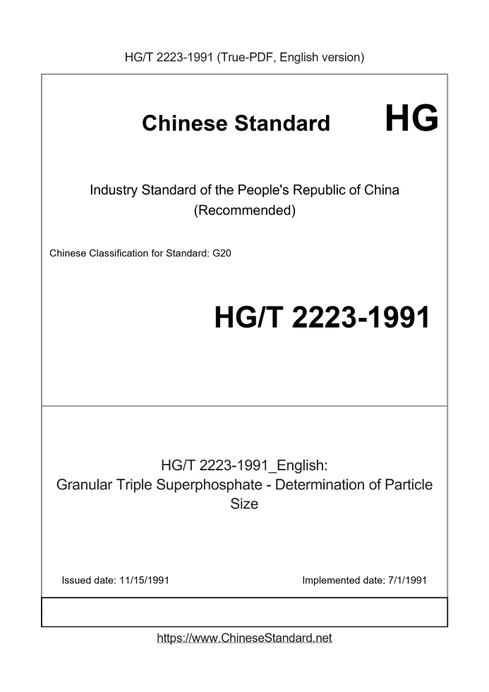Delivery: <= 2 days. True-PDF full-copy in English will be manually translated and delivered via email. HG/T 2223-1991: Granular Triple Superphosphate - Determination of Particle Size