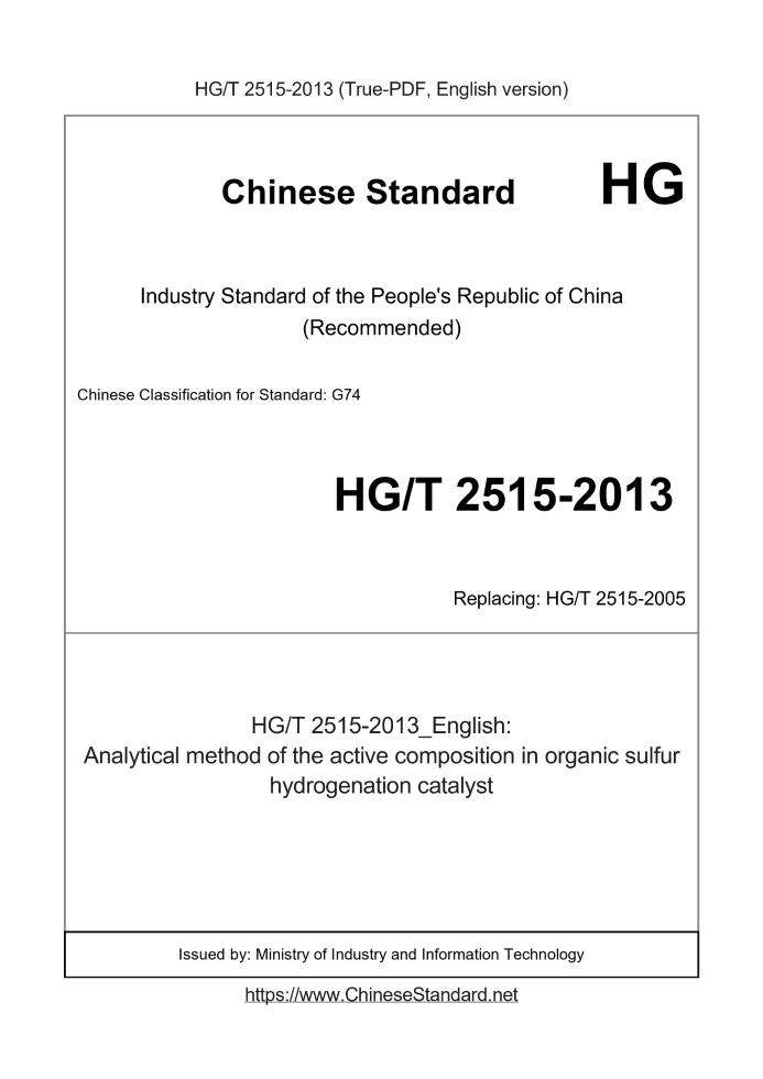 Delivery: <= 3 days. True-PDF full-copy in English will be manually translated and delivered via email. HG/T 2515-2013: Analytical method of the active composition in organic sulfur hydrogenation catalyst Status: Valid HG/T 2515: Historical versions