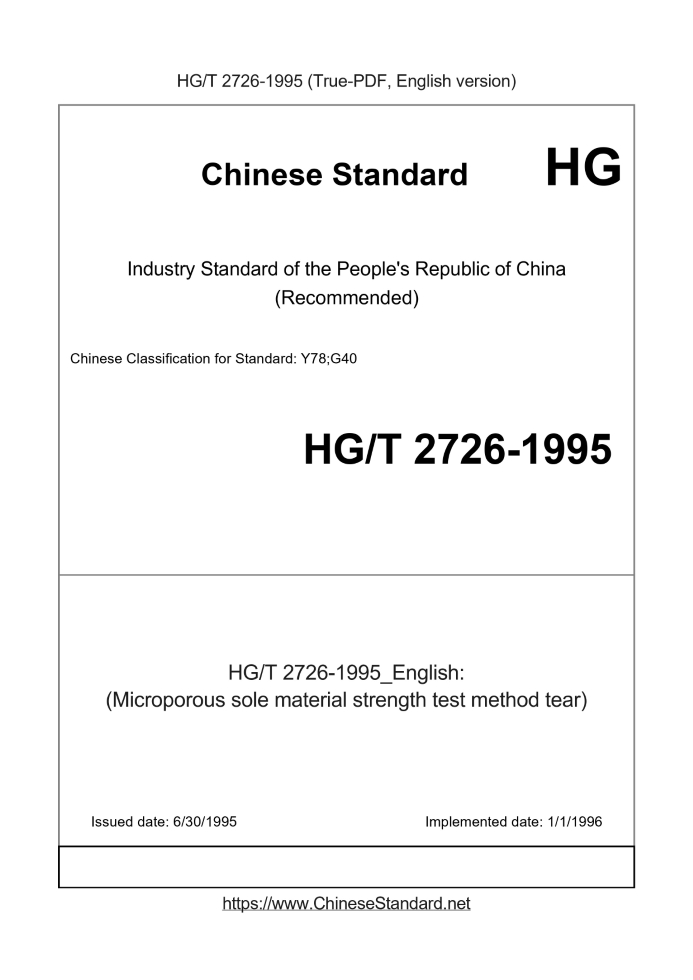 Delivery: <= 2 days. True-PDF full-copy in English will be manually translated and delivered via email. HG/T 2726-1995: (Microporous sole material strength test method tear)