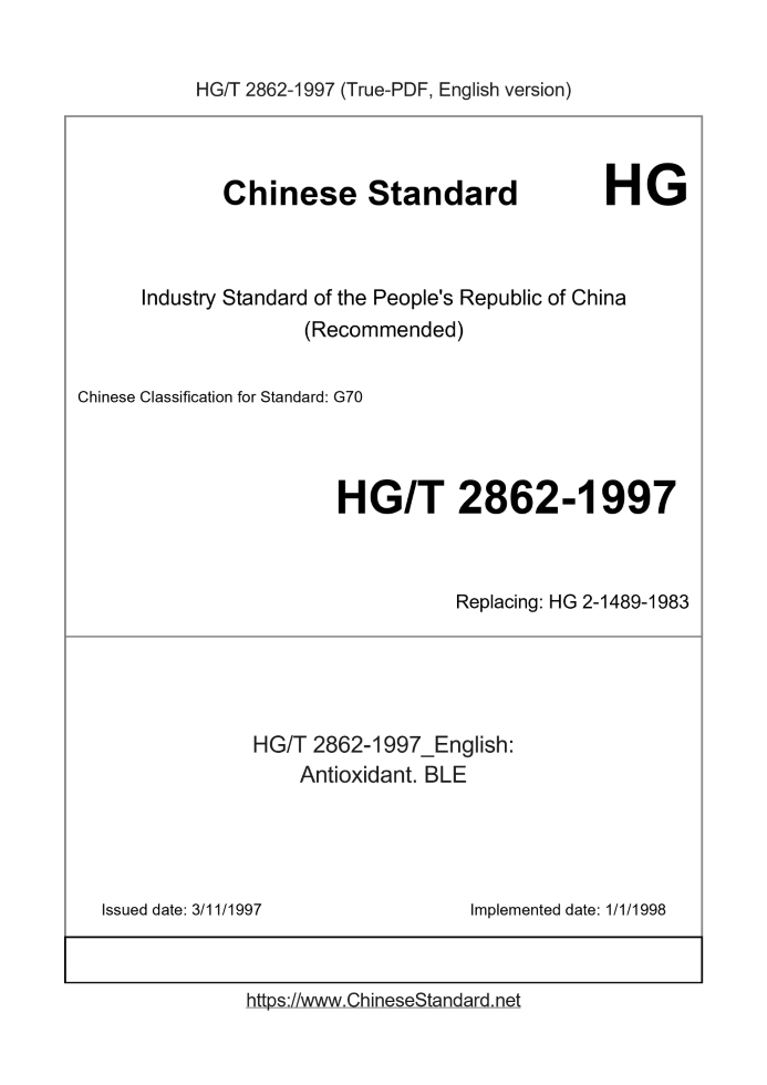 Delivery: <= 3 days. True-PDF full-copy in English will be manually translated and delivered via email. HG/T 2862-1997: Antioxidant. BLE