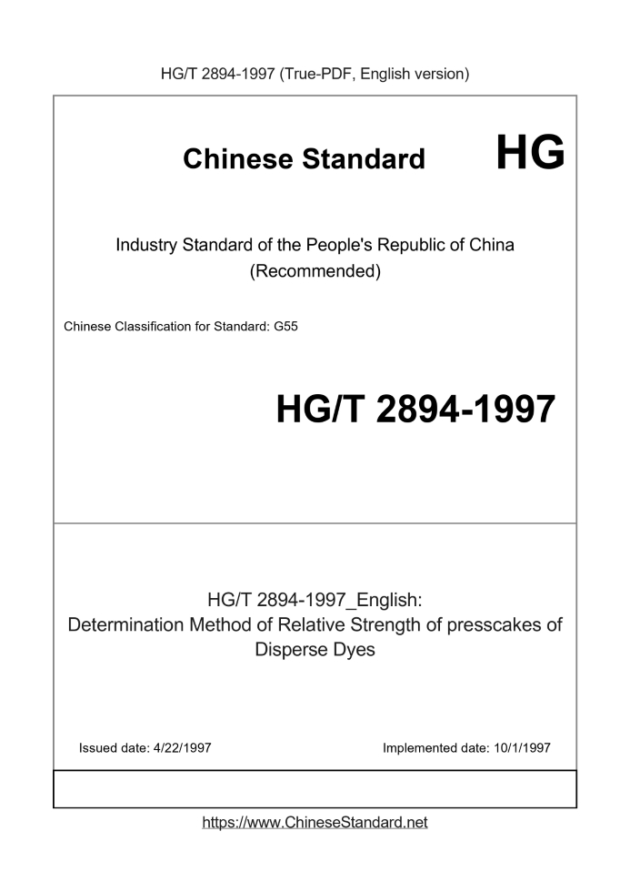 Delivery: <= 2 days. True-PDF full-copy in English will be manually translated and delivered via email. HG/T 2894-1997: Determination Method of Relative Strength of presscakes of Disperse Dyes Status: Obsolete