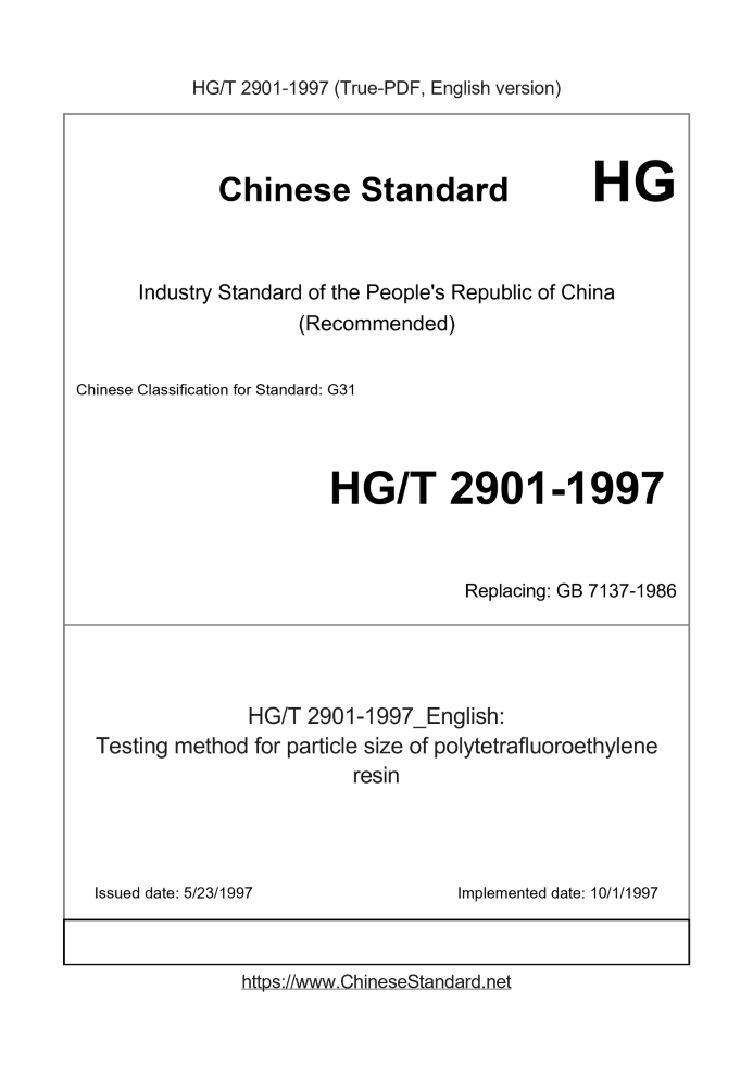 Delivery: <= 3 days. True-PDF full-copy in English will be manually translated and delivered via email. HG/T 2901-1997: Testing method for particle size of polytetrafluoroethylene resin