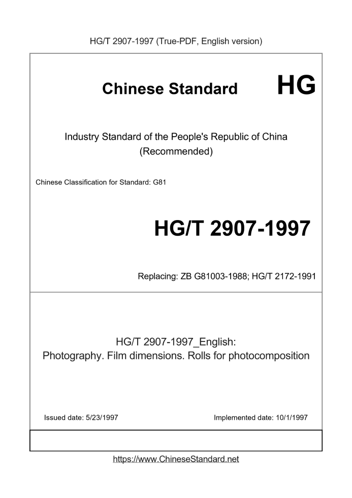 Delivery: <= 3 days. True-PDF full-copy in English will be manually translated and delivered via email. HG/T 2907-1997: Photography. Film dimensions. Rolls for photocomposition