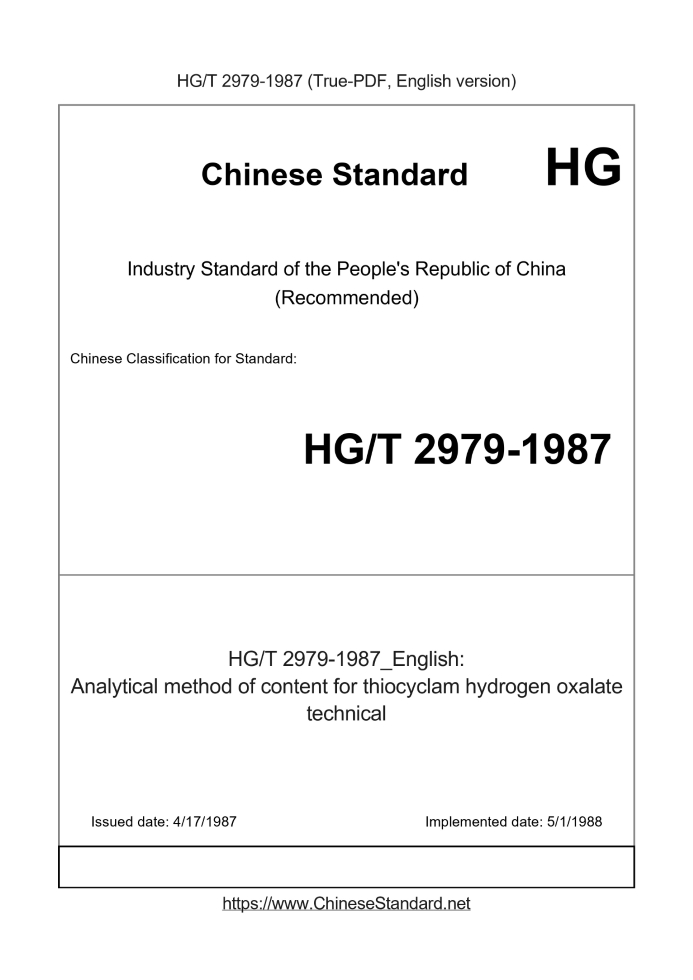 Basic dataStandard ID: HG/T 2979-1987 (HG/T2979-1987)Description (Translated English): Analytical method of content for thiocyclam hydrogen oxalate technical Sector / Industry: Chemical Industry Standard (Recommended) Date of Issue: 4/17/1987 Date of Implementation: 5/1/1988 Tips & Frequently Asked Questions:Question 1: How long will the true-PDF of HG/T 2979-1987_English be delivered?Answer: Upon your order, we will start to translate HG/T 2979-1987_English as soon as possible, and keep you informed of the progress. The lead time is typically 1 ~ 3 working days. The lengthier the document the longer the lead time.Question 2: Can I share the purchased PDF of HG/T 2979-1987_English with my colleagues?Answer: Yes. The purchased PDF of HG/T 2979-1987_English will be deemed to be sold to your employer/organization who actually pays for it, including your colleagues and your employer's intranet.Question 3: Does the price include tax/VAT?Answer: Yes. Our tax invoice, downloaded/delivered in 9 seconds, includes all tax/VAT and complies with 100+ countries' tax regulations (tax exempted in 100+ countries) -- See Avoidance of Double Taxation Agreements (DTAs): List of DTAs signed between Singapore and 100+ countriesQuestion 4: Do you accept my currency other than USD?Answer: Yes. If you need your currency to be printed on the invoice, please write an email to Sales@ChineseStandard.net. In 2 working-hours, we will create a special link for you to pay in any currencies. Otherwise, follow the normal steps: Add to Cart -- Checkout -- Select your currency to pay. |