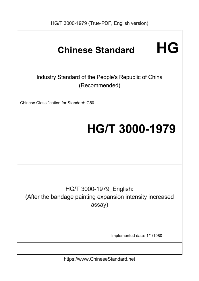 Delivery: <= 2 days. True-PDF full-copy in English will be manually translated and delivered via email. HG/T 3000-1979: (After the bandage painting expansion intensity increased assay) Status: Obsolete