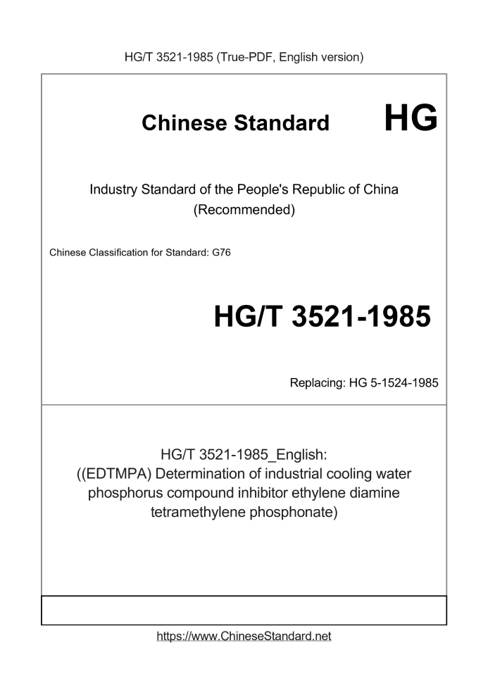 Delivery: <= 2 days. True-PDF full-copy in English will be manually translated and delivered via email. HG/T 3521-1985: ((EDTMPA) Determination of industrial cooling water phosphorus compound inhibitor ethylene diamine tetramethylene phosphonate) Status: Obsolete