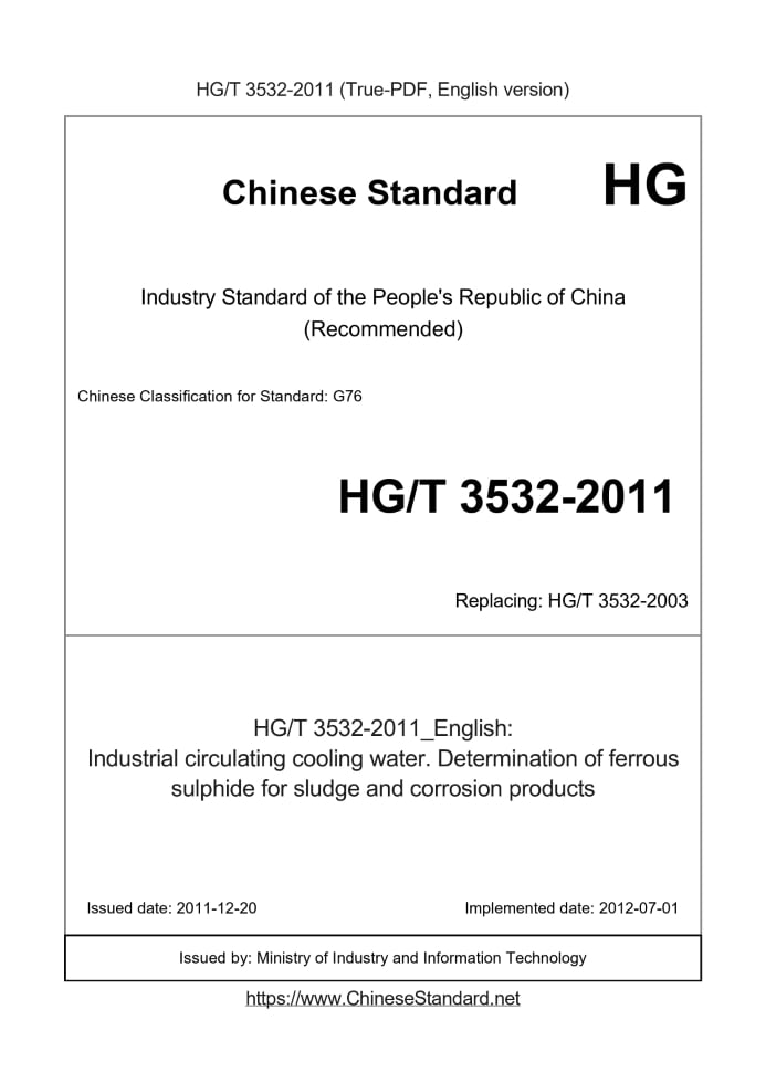 | HG/T 3532-2011 English PDFUS$189.00 ยท In stock Delivery: <= 3 days. True-PDF full-copy in English will be manually translated and delivered via email. HG/T 3532-2011: Industrial circulating cooling water. Determination of ferrous sulphide for sludge and corrosion products Status: Valid HG/T 3532: Historical versions