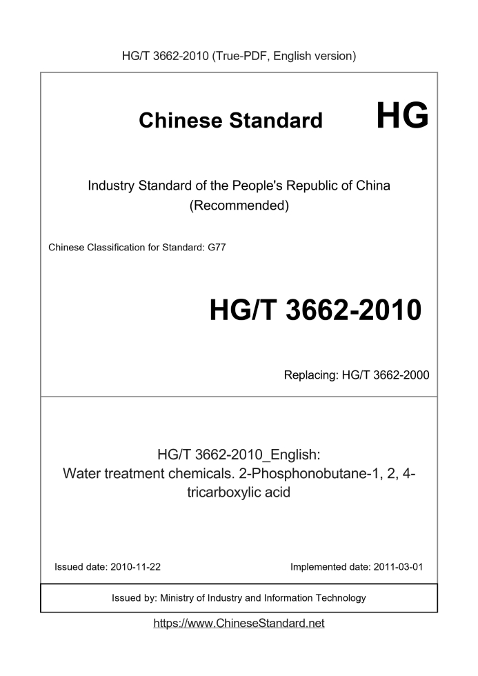 Delivery: <= 3 days. True-PDF full-copy in English will be manually translated and delivered via email. HG/T 3662-2010: Water treatment chemicals. 2-Phosphonobutane-1, 2, 4-tricarboxylic acid Status: Valid HG/T 3662: Historical versions