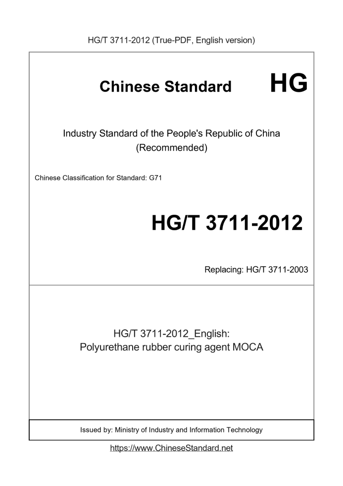 Delivery: <= 3 days. True-PDF full-copy in English will be manually translated and delivered via email. HG/T 3711-2012: Polyurethane rubber curing agent MOCA Status: Valid HG/T 3711: Historical versions