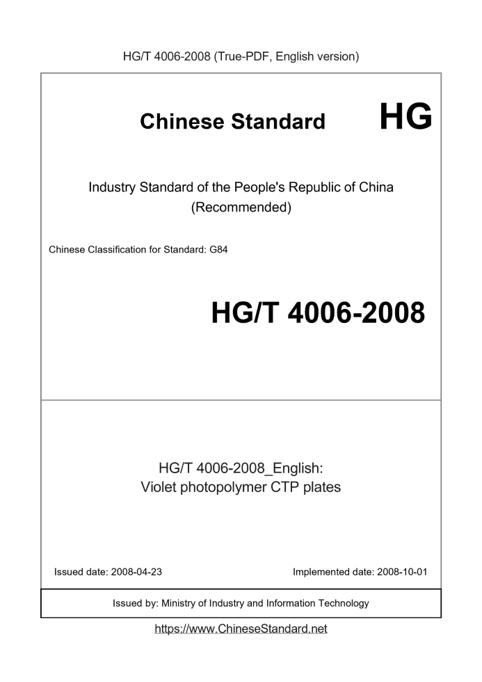 | HG/T 4006-2008 English PDFUS$209.00 ยท In stock Delivery: <= 3 days. True-PDF full-copy in English will be manually translated and delivered via email. HG/T 4006-2008: Violet photopolymer CTP plates Status: Valid