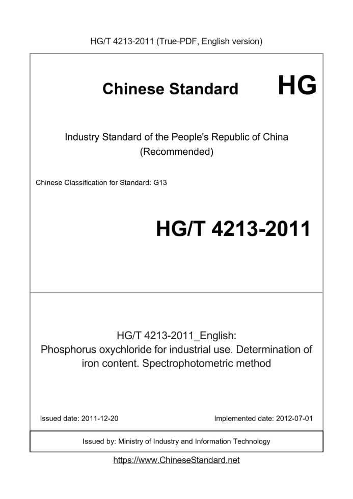 Delivery: <= 3 days. True-PDF full-copy in English will be manually translated and delivered via email. HG/T 4213-2011: Phosphorus oxychloride for industrial use. Determination of iron content. Spectrophotometric method Status: Valid