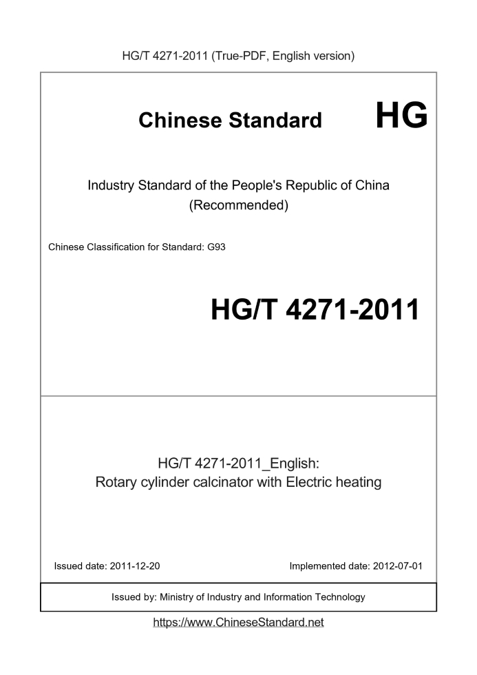 Delivery: <= 4 days. True-PDF full-copy in English will be manually translated and delivered via email. HG/T 4271-2011: Rotary cylinder calcinator with Electric heating Status: Valid