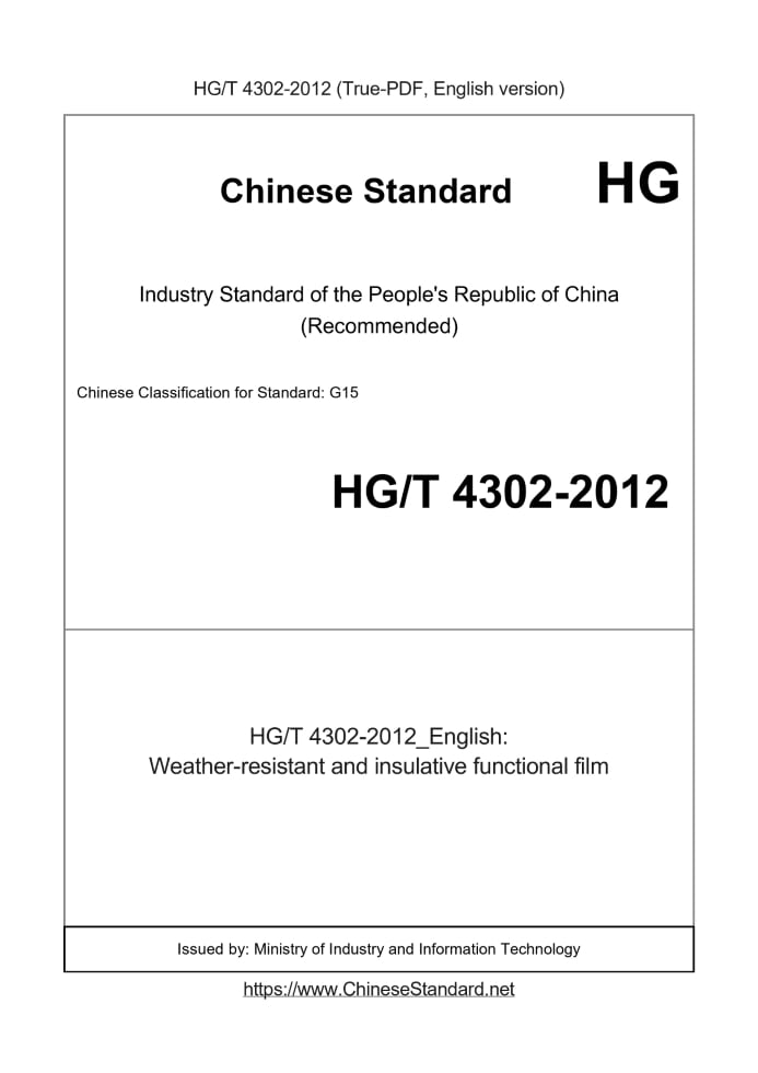 Delivery: <= 3 days. True-PDF full-copy in English will be manually translated and delivered via email. HG/T 4302-2012: Weather-resistant and insulative functional film Status: Valid