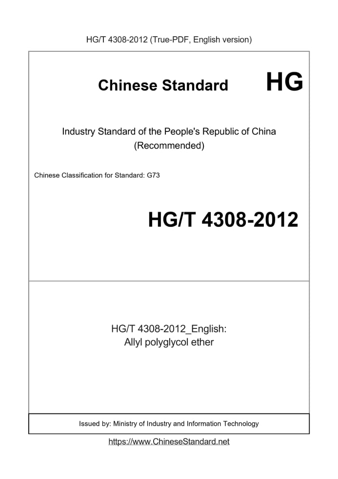 Delivery: <= 3 days. True-PDF full-copy in English will be manually translated and delivered via email. HG/T 4308-2012: Allyl polyglycol ether Status: Valid