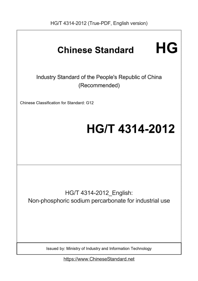 Delivery: <= 3 days. True-PDF full-copy in English will be manually translated and delivered via email. HG/T 4314-2012: Non-phosphoric sodium percarbonate for industrial use Status: Valid