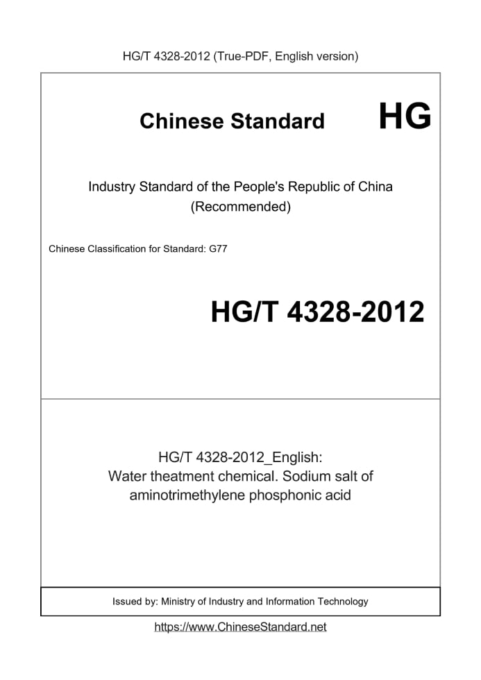 Delivery: <= 3 days. True-PDF full-copy in English will be manually translated and delivered via email. HG/T 4328-2012: Water theatment chemical. Sodium salt of aminotrimethylene phosphonic acid Status: Valid