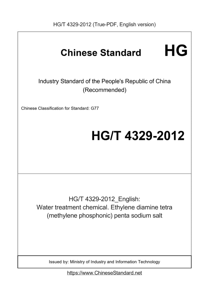 Delivery: <= 3 days. True-PDF full-copy in English will be manually translated and delivered via email. HG/T 4329-2012: Water treatment chemical. Ethylene diamine tetra (methylene phosphonic) penta sodium salt Status: Valid