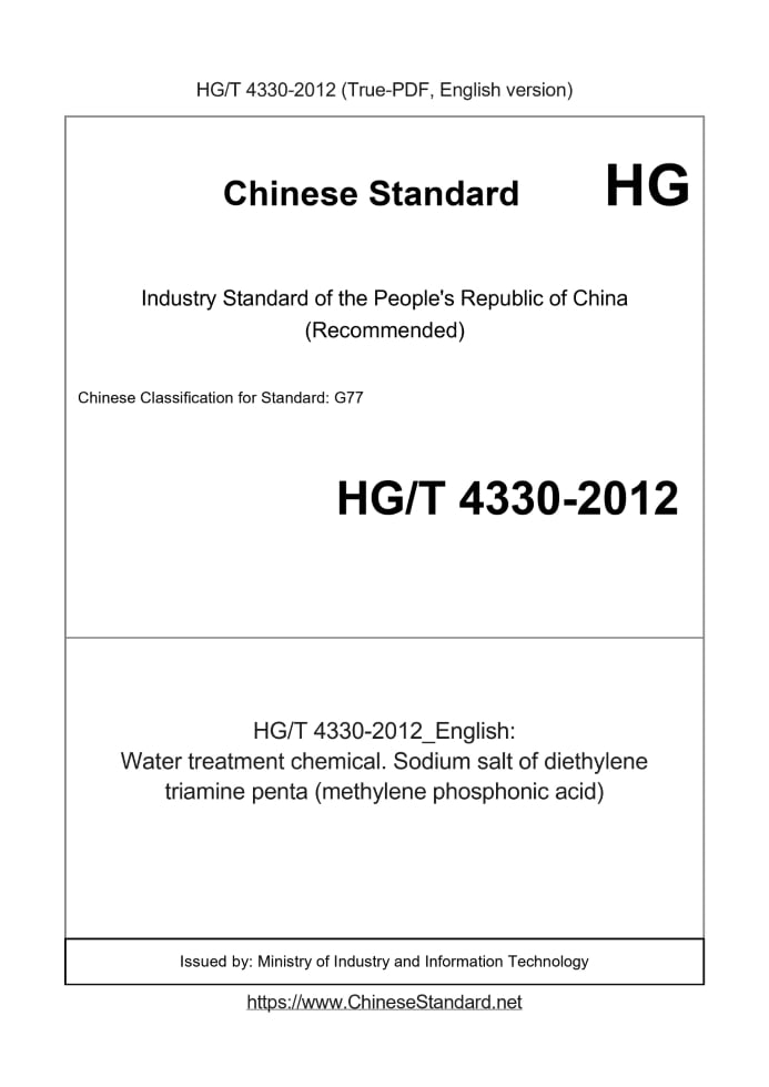 Delivery: <= 3 days. True-PDF full-copy in English will be manually translated and delivered via email. HG/T 4330-2012: Water treatment chemical. Sodium salt of diethylene triamine penta (methylene phosphonic acid) Status: Valid