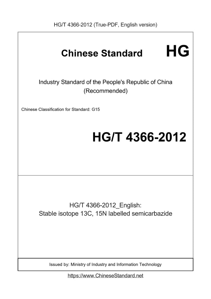 Delivery: <= 3 days. True-PDF full-copy in English will be manually translated and delivered via email. HG/T 4366-2012: Stable isotope 13C, 15N labelled semicarbazide Status: Valid