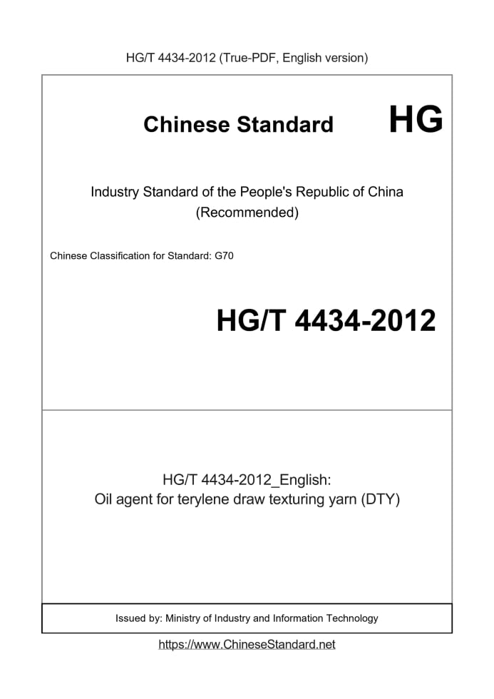 Delivery: <= 3 days. True-PDF full-copy in English will be manually translated and delivered via email. HG/T 4434-2012: Oil agent for terylene draw texturing yarn (DTY) Status: Valid