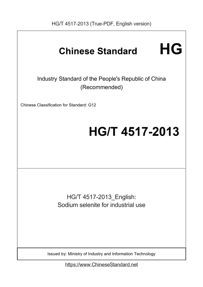 Delivery: <= 3 days. True-PDF full-copy in English will be manually translated and delivered via email. HG/T 4517-2013: Sodium selenite for industrial use Status: Valid