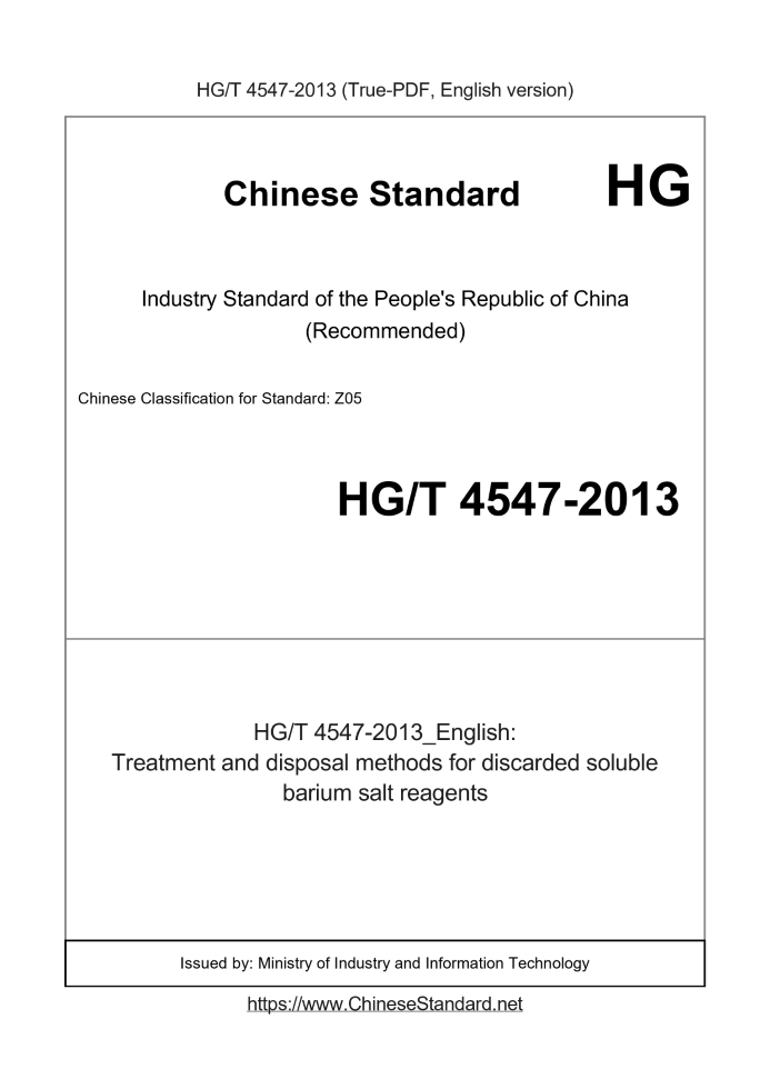 Delivery: <= 3 days. True-PDF full-copy in English will be manually translated and delivered via email. HG/T 4547-2013: Treatment and disposal methods for discarded soluble barium salt reagents Status: Valid