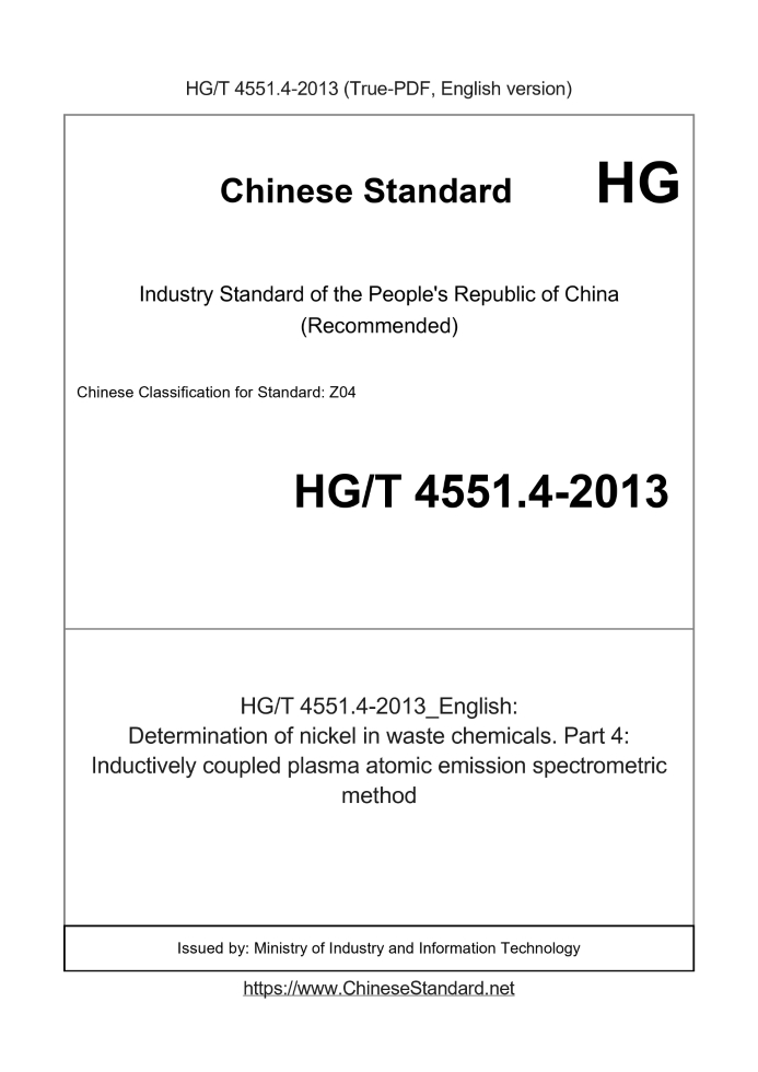 Delivery: <= 3 days. True-PDF full-copy in English will be manually translated and delivered via email. HG/T 4551.4-2013: Determination of nickel in waste chemicals. Part 4: Inductively coupled plasma atomic emission spectrometric method Status: Valid