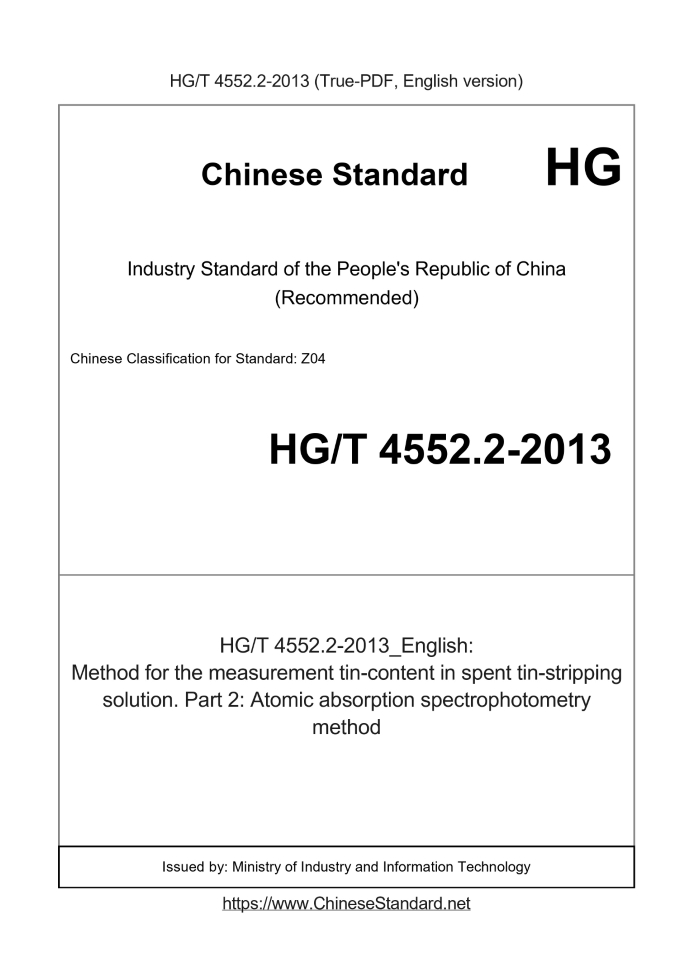 Delivery: <= 2 days. True-PDF full-copy in English will be manually translated and delivered via email. HG/T 4552.2-2013: Method for the measurement tin-content in spent tin-stripping solution. Part 2: Atomic absorption spectrophotometry method Status: Valid