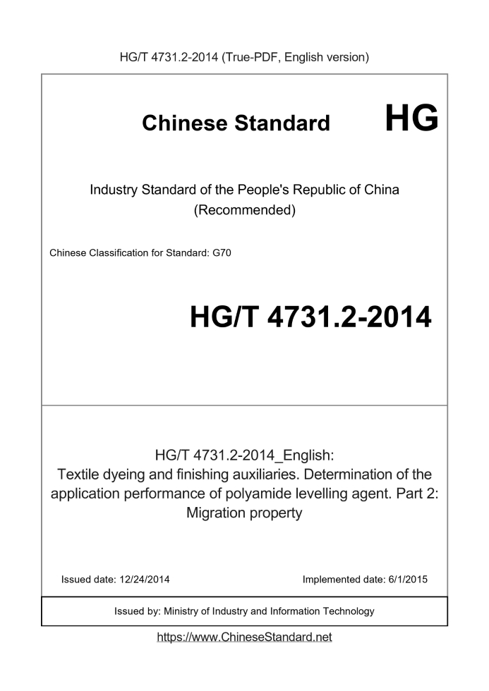 Delivery: <= 3 days. True-PDF full-copy in English will be manually translated and delivered via email. HG/T 4731.2-2014: Textile dyeing and finishing auxiliaries. Determination of the application performance of polyamide levelling agent. Part 2: Migration property Status: Valid