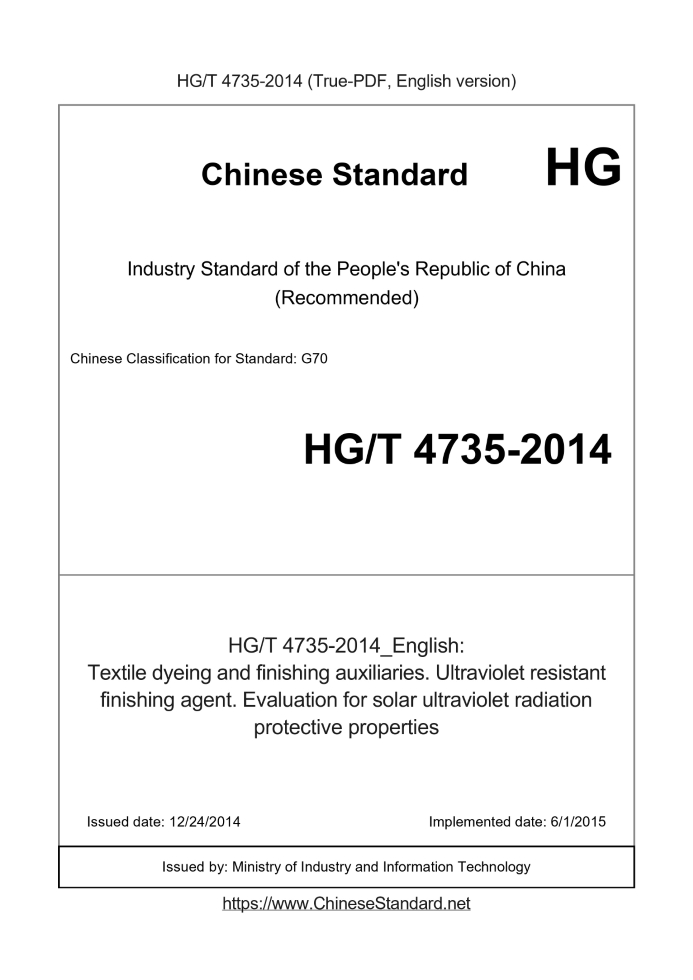 Delivery: <= 3 days. True-PDF full-copy in English will be manually translated and delivered via email. HG/T 4735-2014: Textile dyeing and finishing auxiliaries. Ultraviolet resistant finishing agent. Evaluation for solar ultraviolet radiation protective properties Status: Valid