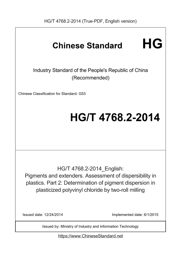 Delivery: <= 3 days. True-PDF full-copy in English will be manually translated and delivered via email. HG/T 4768.2-2014: Pigments and extenders. Assessment of dispersibility in plastics. Part 2: Determination of pigment dispersion in plasticized polyvinyl chloride by two-roll milling Status: Valid