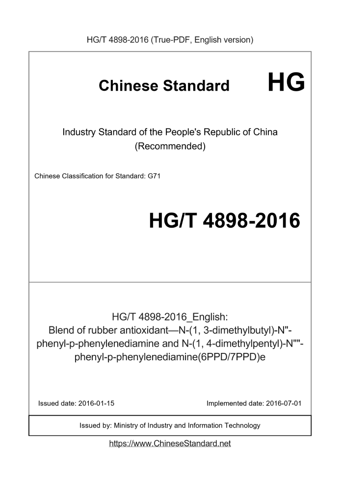 Delivery: <= 3 days. True-PDF full-copy in English will be manually translated and delivered via email. HG/T 4898-2016: Blend of rubber antioxidant—N-(1, 3-dimethylbutyl)-N"-phenyl-p-phenylenediamine and N-(1, 4-dimethylpentyl)-N""-phenyl-p-phenylenediamine(6PPD/7PPD)e Status: Valid