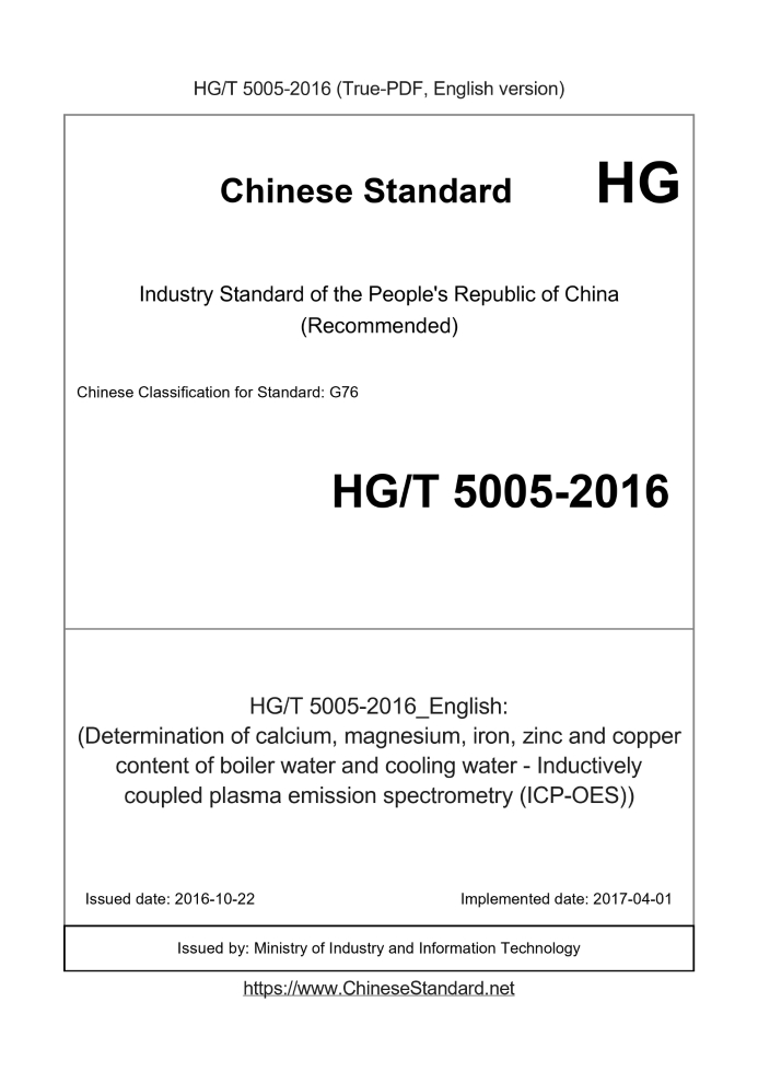 Delivery: <= 3 days. True-PDF full-copy in English will be manually translated and delivered via email. HG/T 5005-2016: (Determination of calcium, magnesium, iron, zinc and copper content of boiler water and cooling water - Inductively coupled plasma emission spectrometry (ICP-OES)) Status: Valid