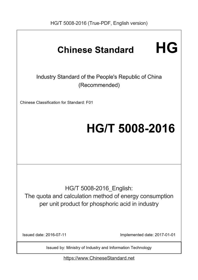 Delivery: <= 3 days. True-PDF full-copy in English will be manually translated and delivered via email. HG/T 5008-2016: The quota and calculation method of energy consumption per unit product for phosphoric acid in industry Status: Valid