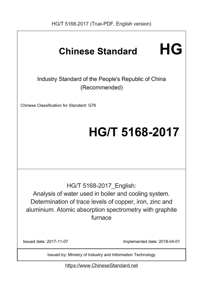 Delivery: <= 3 days. True-PDF full-copy in English will be manually translated and delivered via email. HG/T 5168-2017: Analysis of water used in boiler and cooling system. Determination of trace levels of copper, iron, zinc and aluminium. Atomic absorption spectrometry with graphite furnace Status: Valid