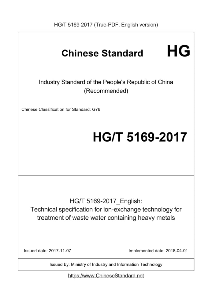 | HG/T 5169-2017 English PDFUS$259.00 ยท In stock Delivery: <= 3 days. True-PDF full-copy in English will be manually translated and delivered via email. HG/T 5169-2017: Technical specification for ion-exchange technology for treatment of waste water containing heavy metals Status: Valid
