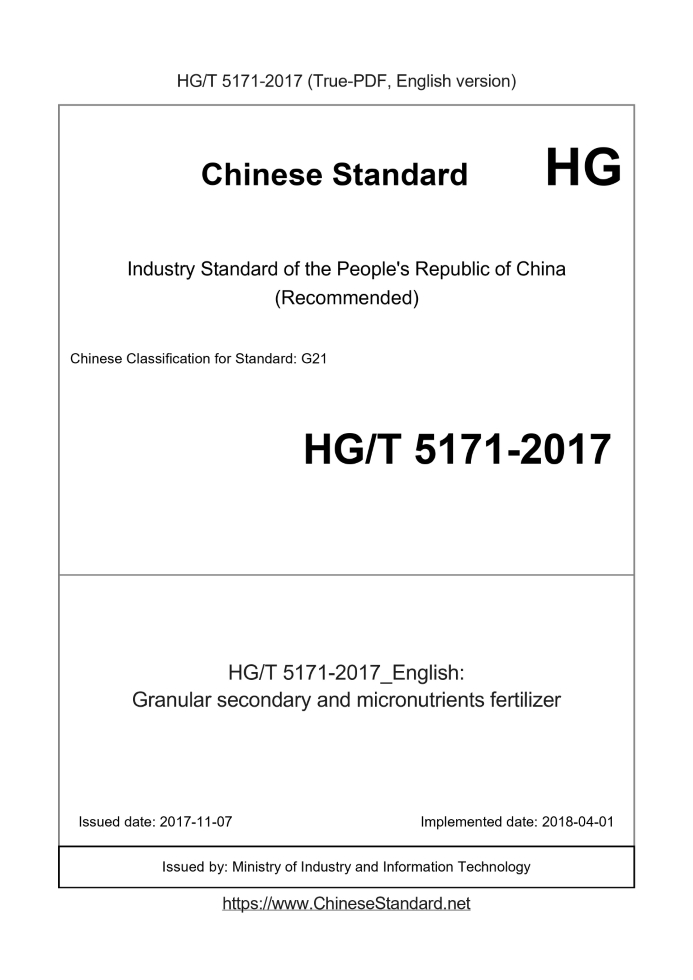 | HG/T 5171-2017 English PDFUS$169.00 ยท In stock Delivery: <= 3 days. True-PDF full-copy in English will be manually translated and delivered via email. HG/T 5171-2017: Granular secondary and micronutrients fertilizer Status: Valid