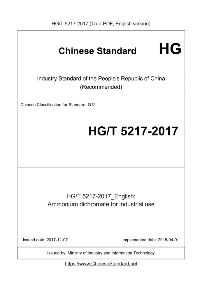 Delivery: <= 3 days. True-PDF full-copy in English will be manually translated and delivered via email. HG/T 5217-2017: Ammonium dichromate for industrial use Status: Valid