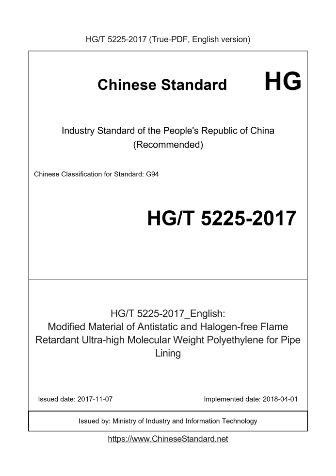Delivery: <= 3 days. True-PDF full-copy in English will be manually translated and delivered via email. HG/T 5225-2017: Modified Material of Antistatic and Halogen-free Flame Retardant Ultra-high Molecular Weight Polyethylene for Pipe Lining Status: Valid